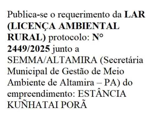 | 07/10/2025 Publica-se o requerimento da LAR (LICENÇA AMBIENTAL RURAL) protocolo: N° 1889/2024 junto a SEMMA/ALTAMIRA |