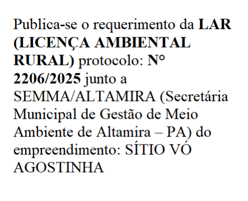 | 07/10/2025 Publica-se o requerimento da LAR (LICENÇA AMBIENTAL RURAL) protocolo: N° 2206/2025 junto a SEMMA/ALTAMIRA |