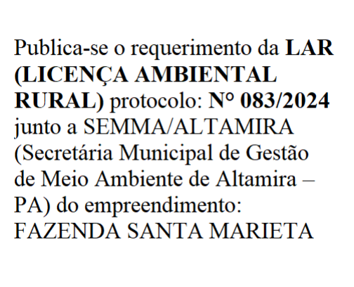 | 07/10/2025 Publica-se o requerimento da LAR (LICENÇA AMBIENTAL RURAL) protocolo: N° 083/2024 junto a SEMMA/ALTAMIRA |
