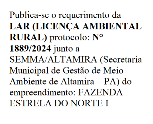 | 07/10/2025 Publica-se o requerimento da LAR (LICENÇA AMBIENTAL RURAL) protocolo: N° 1889/2024 junto a SEMMA/ALTAMIRA |